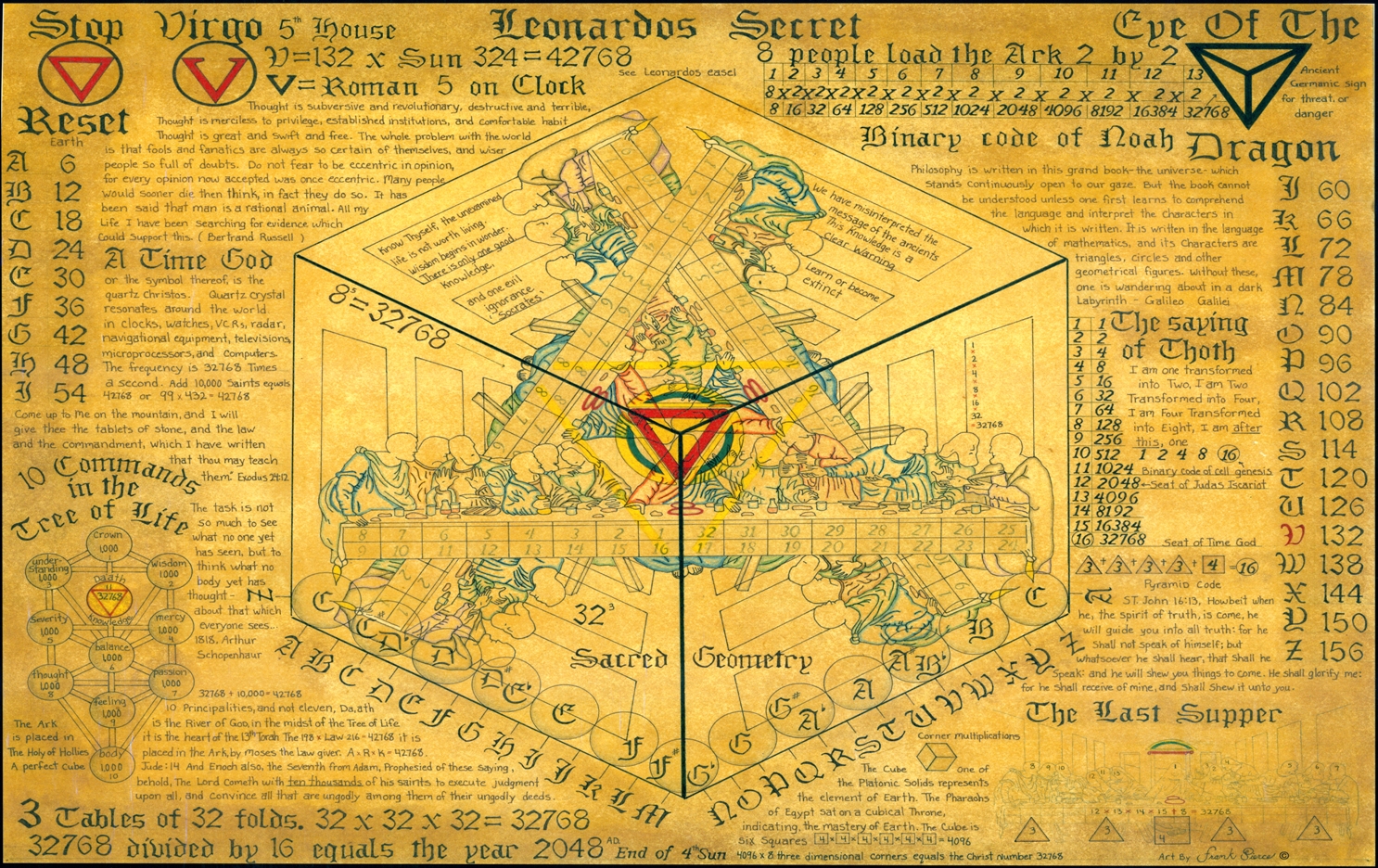 FP — I don’t do too well with language – it’s my worst subject. I’m a terrible speaker. I’m terrible at spelling. I’m trying to overcome that weakness, but it’s just not my subject. My mind works in a different way. I see symbols in mathematics, and I look at things upside down and inverted, and compare them and overlay them. This helps me to better understand the universe that we’re living in. [. . . ] It’s based on, as I said, time-defiant symbols like the binary code of cell reproduction – as long as there’s life in the universe, that will remain constant. So if you have an intelligent life form that understands the binary cell code, which is simply two times two times two, and so on – it’s computer code, as well – you’ll see. All of religion has this binary code written into it – and there are plenty of proofs. You know about the chromatic music scale? So did the ancients. Basically you have eight whole notes between octaves and then 12 half notes between octaves, and the 13th half note is the same note repeated in a higher octave. This is basically Christ and the 12 Disciples. Or the Temple of Osiris in Egypt. Or the clock — the center being the place of power. The center of a clock is where all the electrical power is flowing through to move the hands. So the center of all atoms actually are connected through an inter-dimensional doorway – and this is where all this power comes from that animates all reality. Because of the way I think, I’ve been able to decode ancient mantras from Nepal, The Last Supper by Leonardo da Vinci, the Zodiac in ways that I’ve never seen done before – and they’re all telling me exactly the same thing. They’re all giving me this frequency that’s resonating in every watch and clock around the world as a number representing this deity that most religions speak of. He’s a time god. It’s all about time. The “King of Kings” is the Lord of Time. Christ was born at the winter solstice, when the sun is reemerging from its darkest hour – and then you get the presence of what they call God, which is the current moment, the now. It’s the gift of the New Year – God gives us more time to get our act together. I don’t understand how anybody can’t see it, but at the same time I have to have scholars look at it, because I could be totally insane.