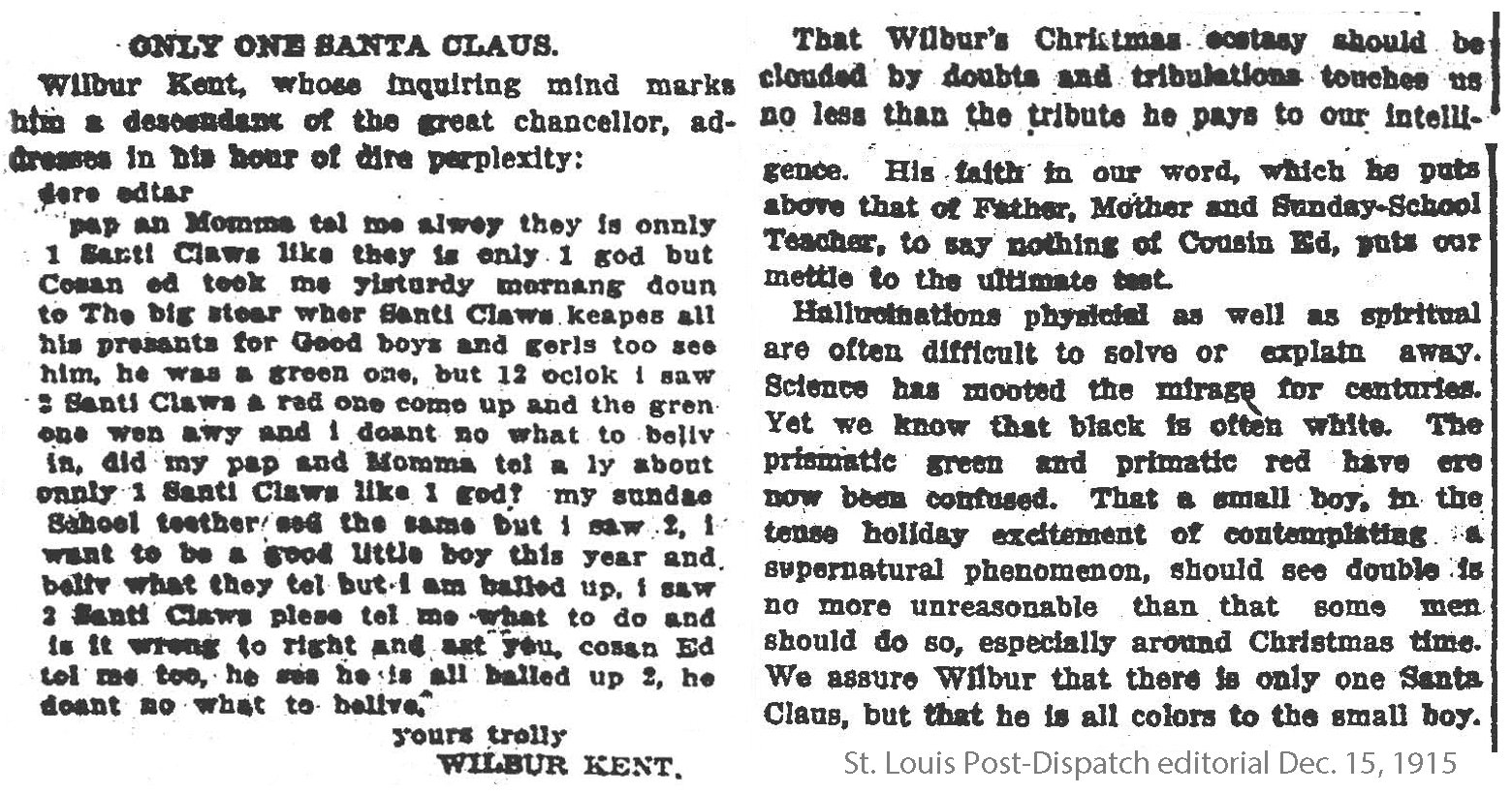 Unlike Virginia, who was the subject of news stories throughout her long life, nobody remembers little Wilbur Kent and his letter to the St. Louis Post-Dispatch, in which he asked whether there were two Santa Clauses because that’s how many he saw — on the very same day! He was deeply troubled because his “pap an mamma” said there was only one Santa, just like “they is only 1 god.”
