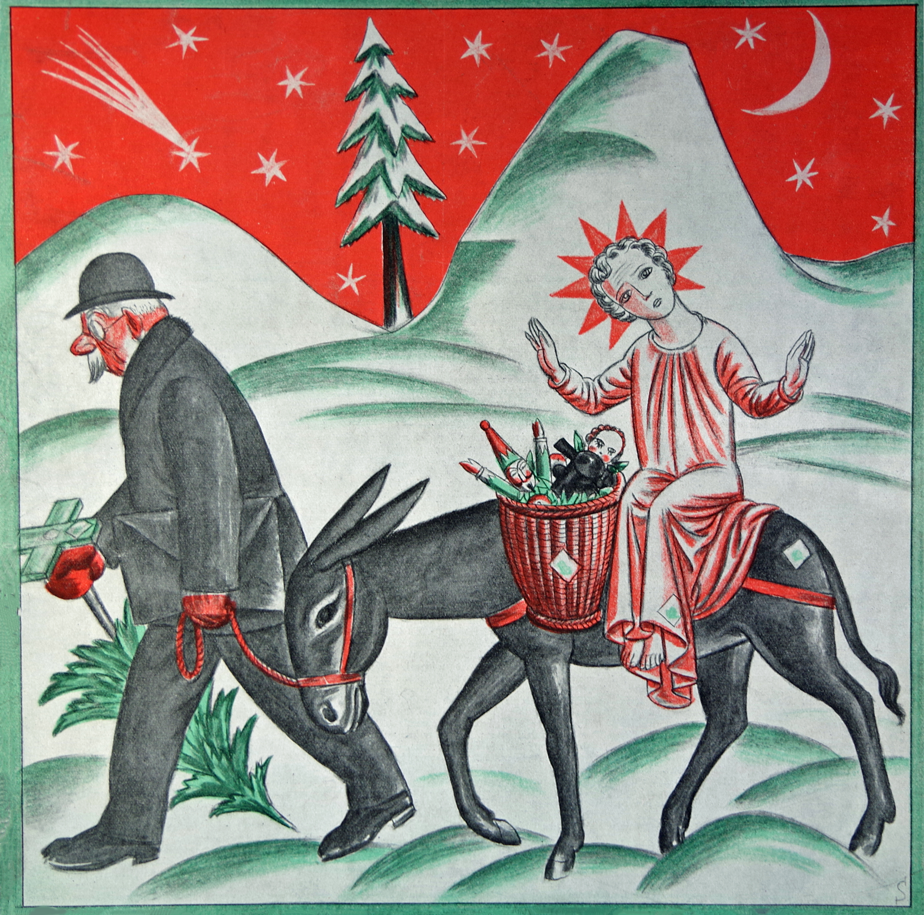 “Um Himmel sind die Stern’ schon angezündet, Uns ist vom Hohen Herrn viel heils gesundet. Ein Knäblein sollten wir in Lieb’ umspannen. Ach — der Gerichtvollzieh’r führt es von dannen.” — Simplicissimus, Dec. 21, 1925