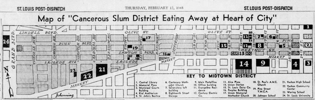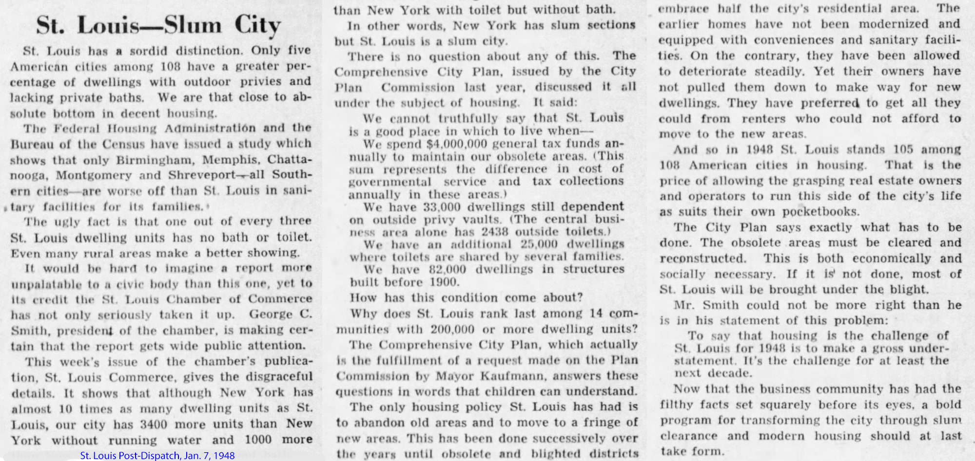 “And so in 1948 St. Louis stands 105 among 108 American cities in housing. That is the price of allowing the grasping real estate owners and operators to run this side of the city’s life as suits their own pocketbooks.”