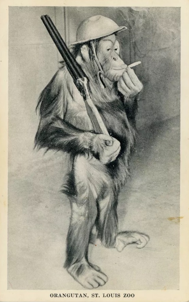 Jerry, the Post-Dispatch reported, “has posed as an infantry private and as a general. Yesterday, he entered the artillery. A toy cannon was wheeled up in front of the new ape house and Jerry, wearing a tin helmet, stood behind the howitzer to defend the zoo against attack. Then he fired the gun and the noise scared him right into his keeper’s arms.”