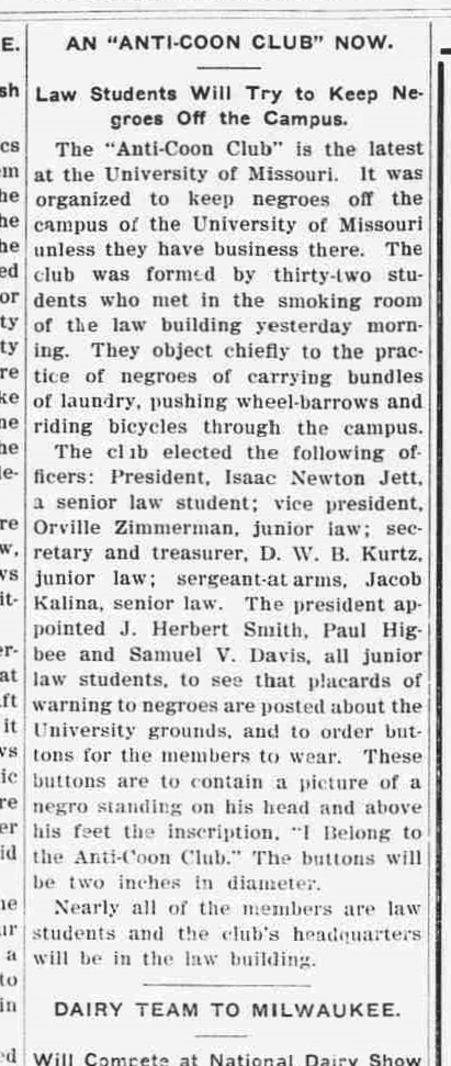 The ‘Anti-Coon Club’ is the latest at the University of Missouri. It was organized to keep negroes off the campus of the University of Missouri unless they have business there. The club was formed by thirty-two students who met in the smoking room of the law building yesterday morning. They object chiefly to the practice of negroes of carrying bundles of laundry, pushing wheel-barrows and riding bicycles through the campus.