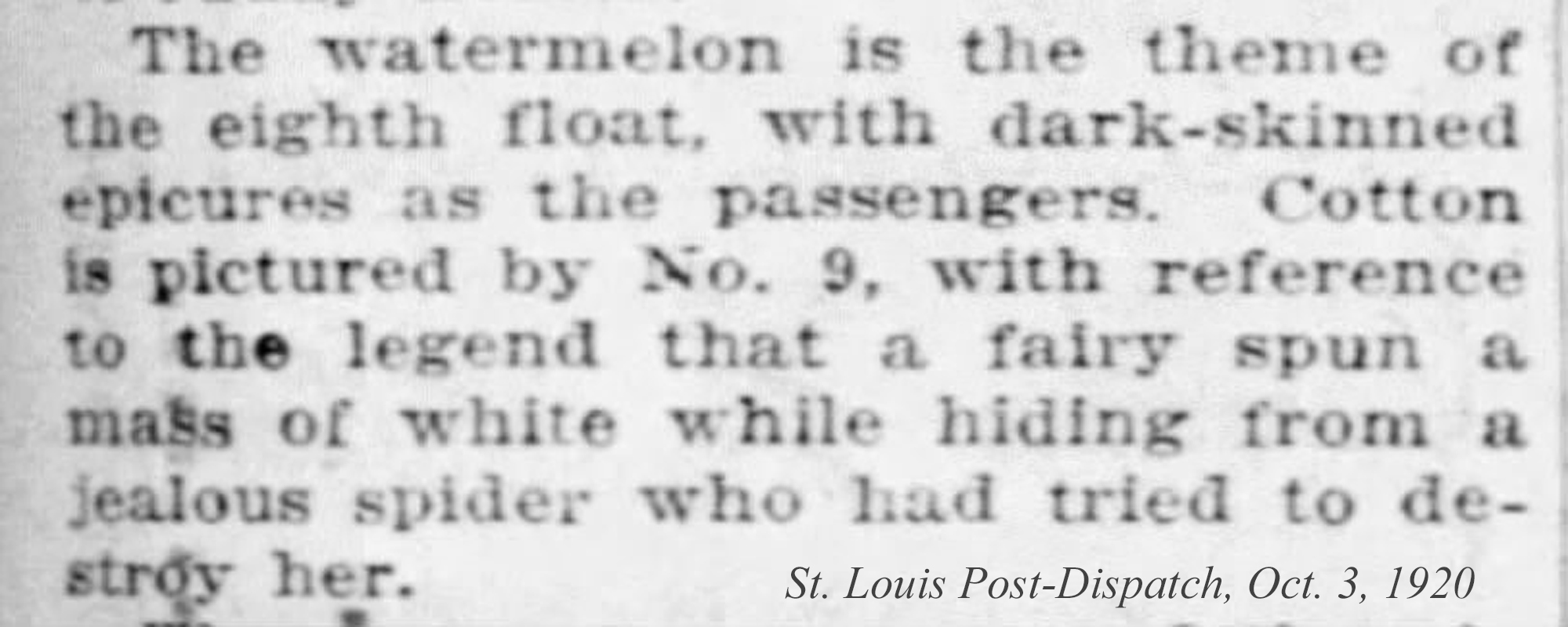 “The watermelon is the theme of the eighth float, with dark-skinned epicures as the passengers.” — St. Louis Post-Dispatch, Oct. 3, 1920