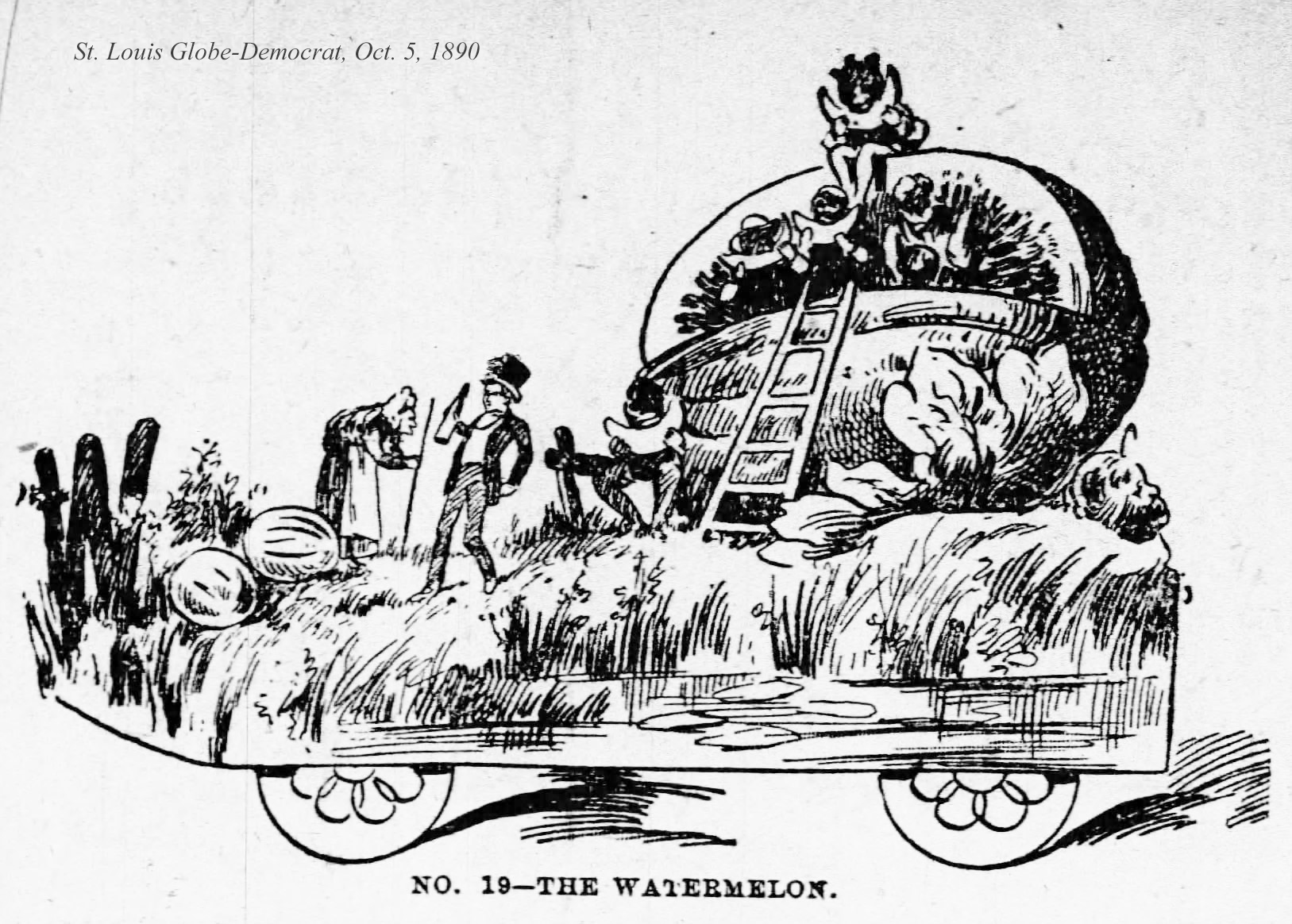 “One of the best comic floats in the procession will bear W as its key letter. Its distinguishing feature is a huge Watermelon in the background with a generous section taken out. A number of American citizens of ‘African descent’ are discovered sitting in the breach and gormandizing on its luscious interior, while another is ascending on a ladder.” — St. Louis Globe-Democrat, Oct. 5, 1890