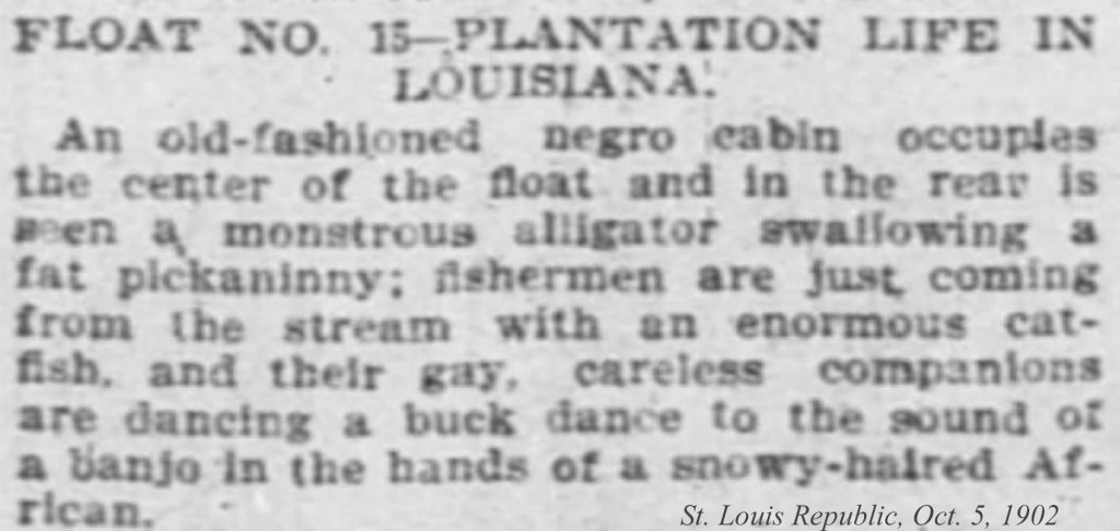 “An old-fashioned negro cabin occupies the center of the float and in the rear is seen a monstrous alligator swallowing a fat pickaninny; fishermen are just coming from the stream with an enormous catfish, and their gay, careless companions are dancing a buck dance to the sound of a banjo in the hands of a snowy-haired African.” — St. Louis Republic, Oct. 5, 1902