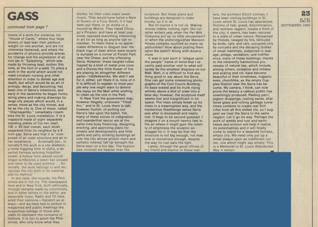 “I have been visiting buildings in St. Louis which St. Louis has abandoned. Victims of fear, greed, discrimination, and reckless neglect, maybe a third of the city, it seems, has been restored to a state of urban nature. Ransacked by thieves, ravaged by fire, befouled by birds, cats, and rates, occupied only by outcasts and the decaying bodies of small mammals, subjected to leakage, pillage, vandalism, and indifference, many of these buildings, thanks to the inherently harmonious processes of natural law, which include, among others, oxidation and mildew and scaling and rot, have become beautiful in their loneliness, majestic even, churchlike, as the empty Cupples Station near the Serra has become. My camera, I think, can now prove the beauty a callous public has unwittingly produced. Peeling paint, pigeon dropping, rusting eaves, shattered glass and rotting garbage sometimes combine to create real Still Lifes from all this still life, so I suggest we treat the Serra to the same neglect. Let it go its way. Perhaps the work of weeds and rust and earth-heave and erosion will help it realize its potentialities and it will finally come to stand for a deserted fortress, empty city. We need only put up a small plaque upon an indifferent corner, one which might say simply: This is a Memorial to St. Louis Abandoned. May it remain.”