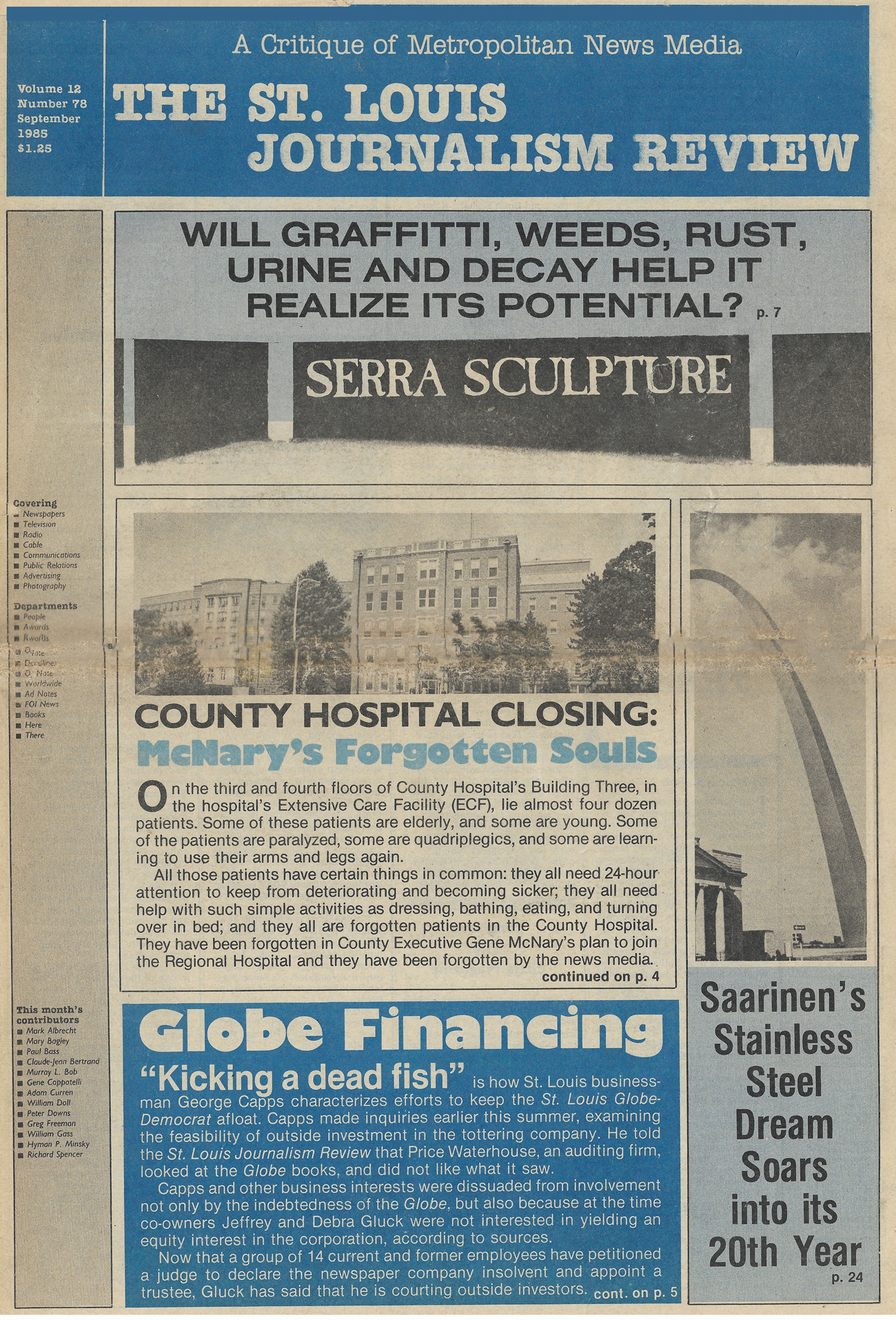 The “Twain” sculpture by Richard Serra, located in downtown St. Louis, garnered an excessive amount of media attention in the early 1980s. This was due, in part, to its expense and because it was promoted by the St. Louis Post-Dispatch while simultaneously being criticized by the declining St. Louis Globe-Democrat.