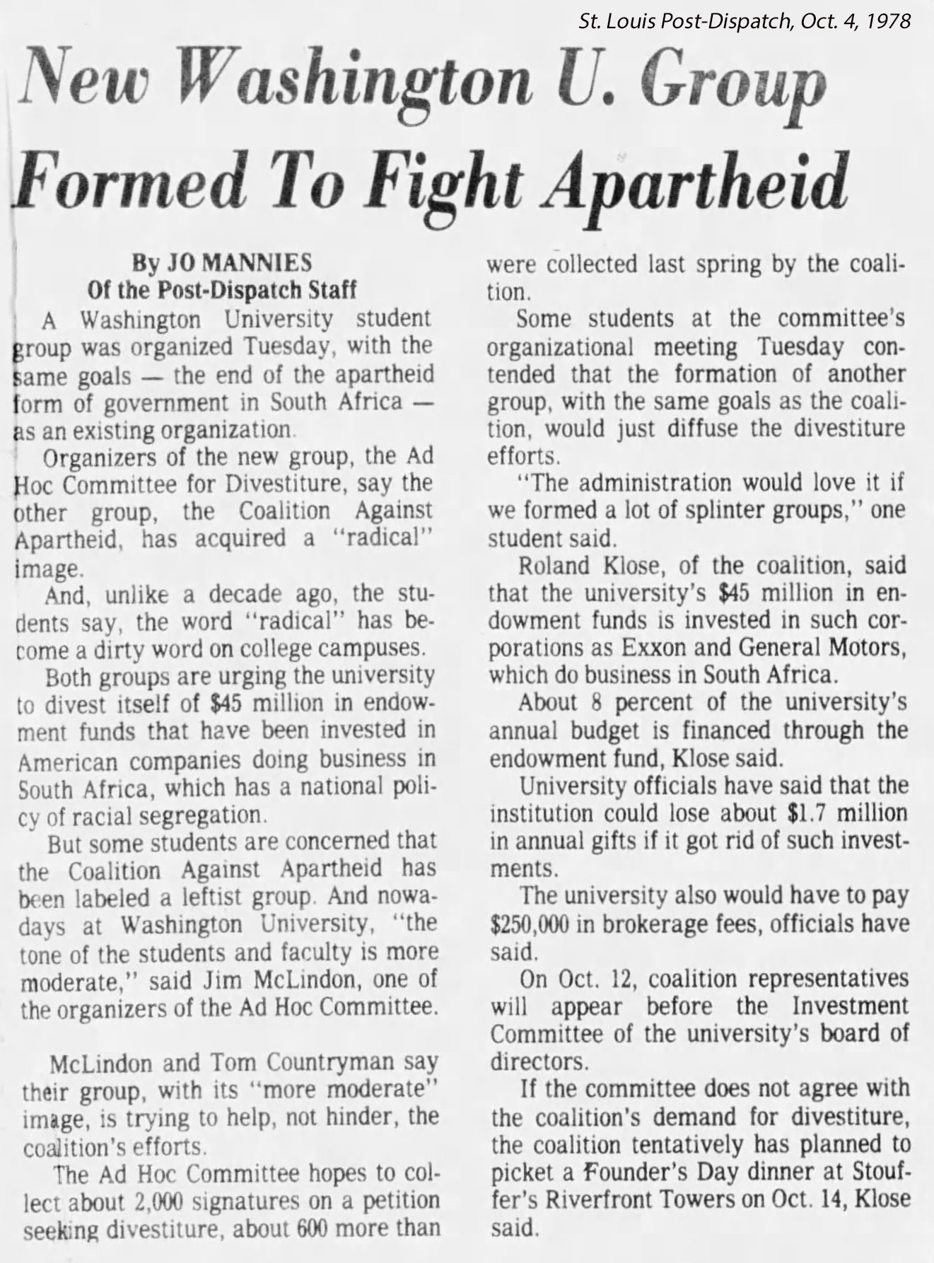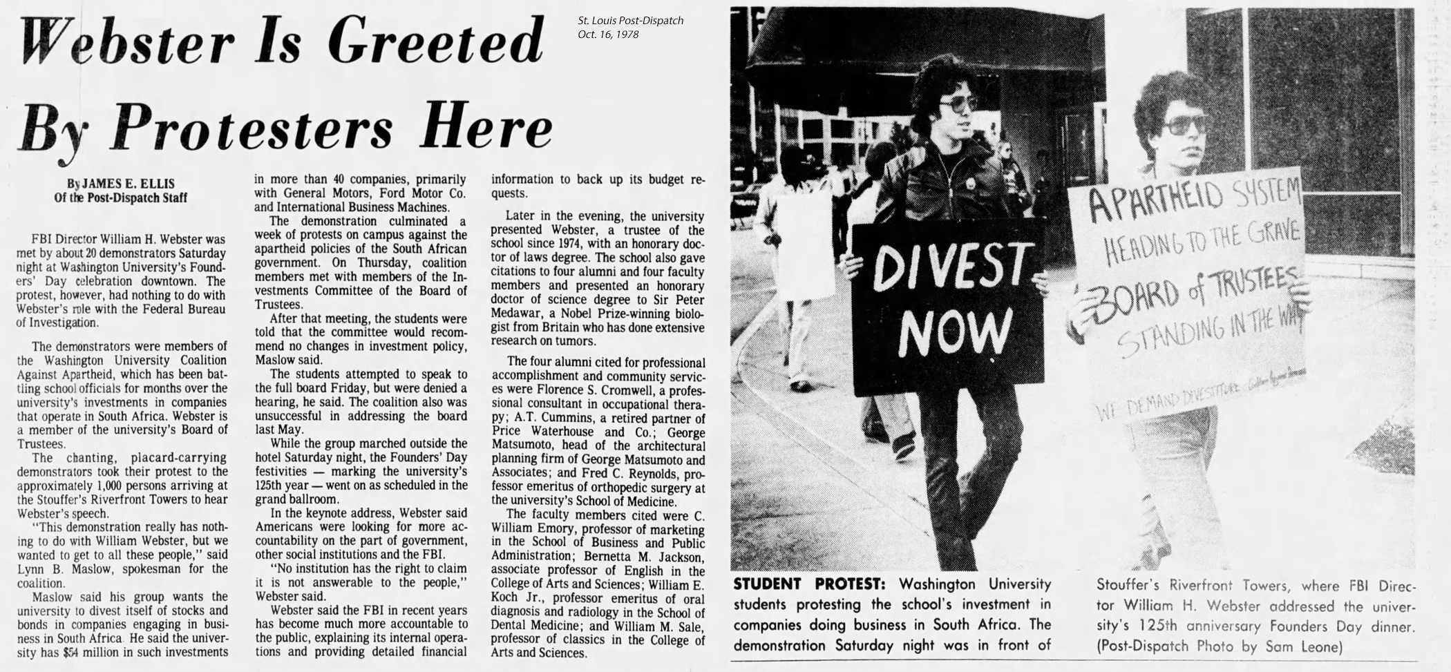 Protesting apartheid at Washington University — in 1978. It was a different time. Many demonstrations, no arrests. FBI Director William Webster, a university trustee, was keynote speaker at the Founders’ Day celebration that year.