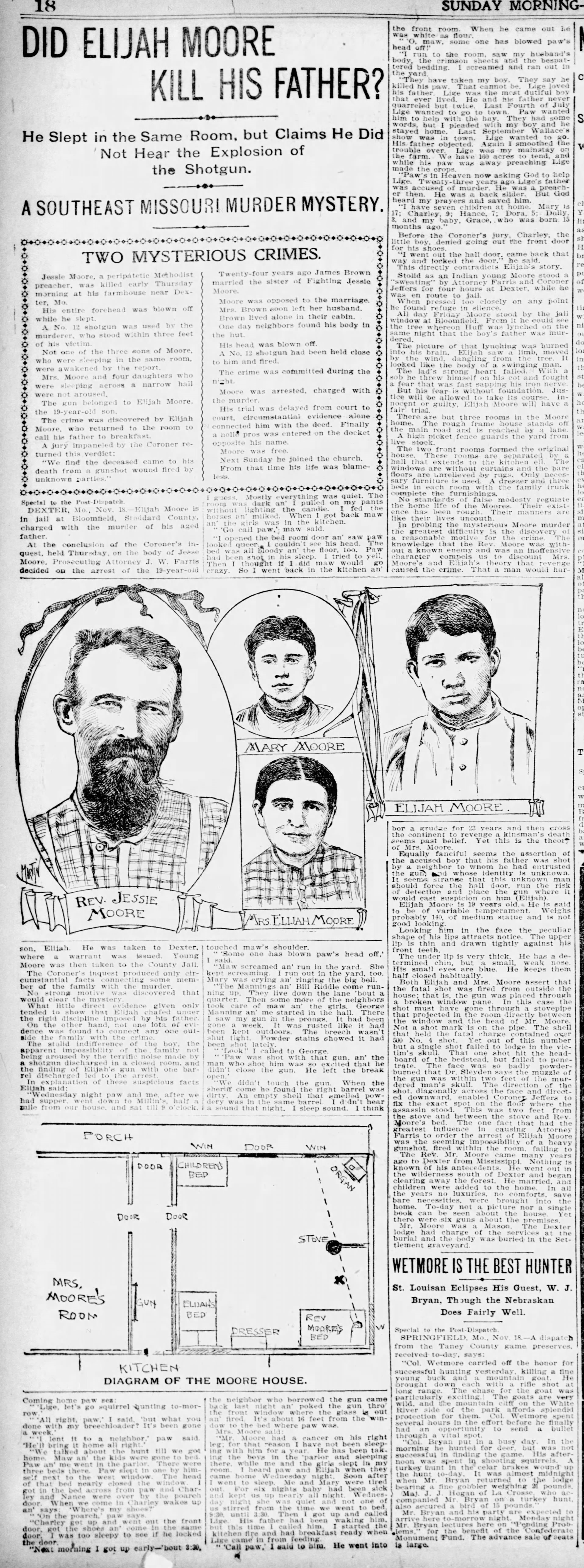“The knowledge that the Rev. Moore was without a known enemy and was an inoffensive character compels us to discount Mrs. Moore’s and Elijah’s theory that revenge caused the crime,” the Post-Dispatch wrote.
