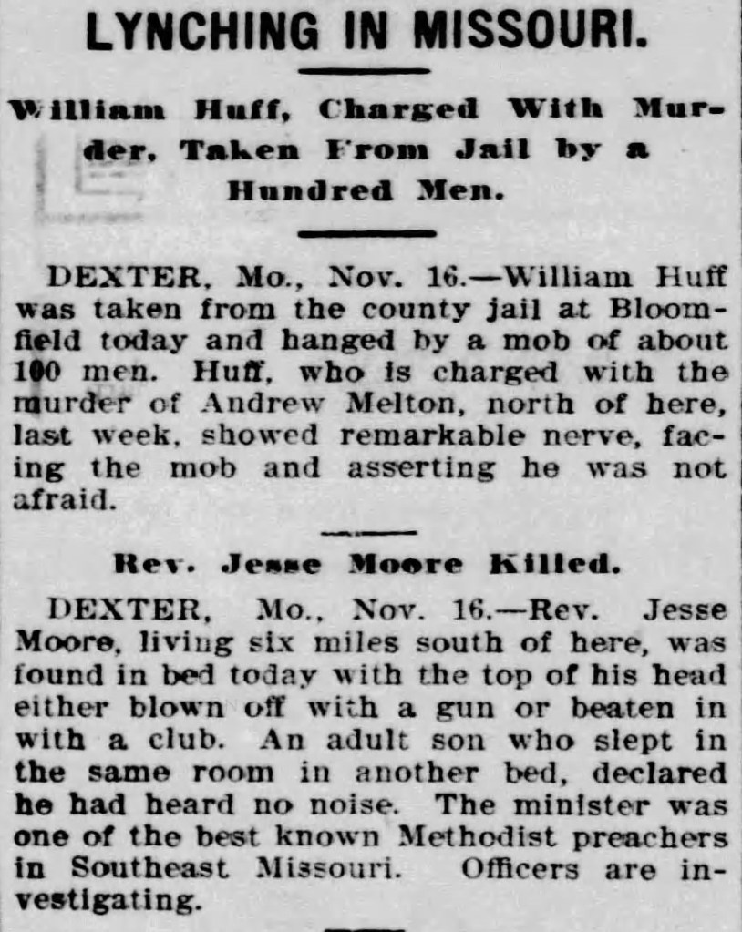 A second trial was held, and Elijah was acquitted in June 1901. (Not everyone was convinced of his innocence. The Democrat published in nearby Caruthersville groused: “Elijah Moore, who was convicted of killing his father, Rev. Jesse Moore, … was acquitted last week. The parson is in glory, no doubt, and if Elijah ever tries to break in what the old man will do for him will be a plenty.”)