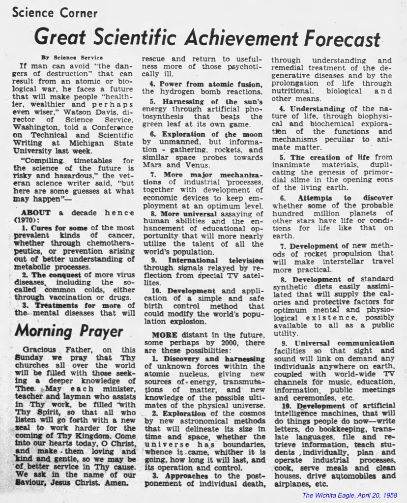 Science Service’s predictions about likely technological advances were widely published in the nation’s press in 1958. Some were spot-on; others are still being pursued. Among them: the adoption of “artificial intelligence machines that will do things people do now.” Science Service (today’s Society for Science) was launched by E.W. Scripps and zoologist William Ritter in 1921. They believed “a healthy democracy depended on a public understanding of science.” (Note the coupling of a science story with a morning prayer by the Wichita Eagle.)