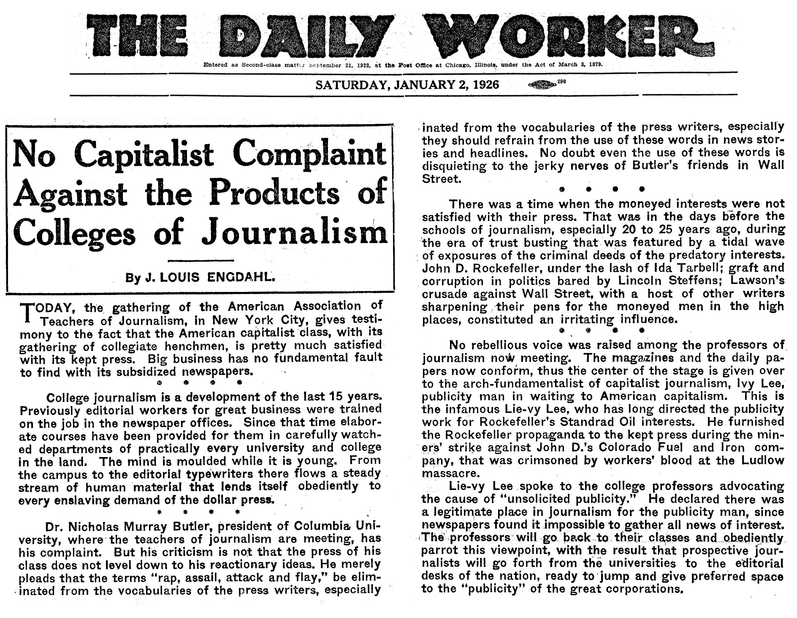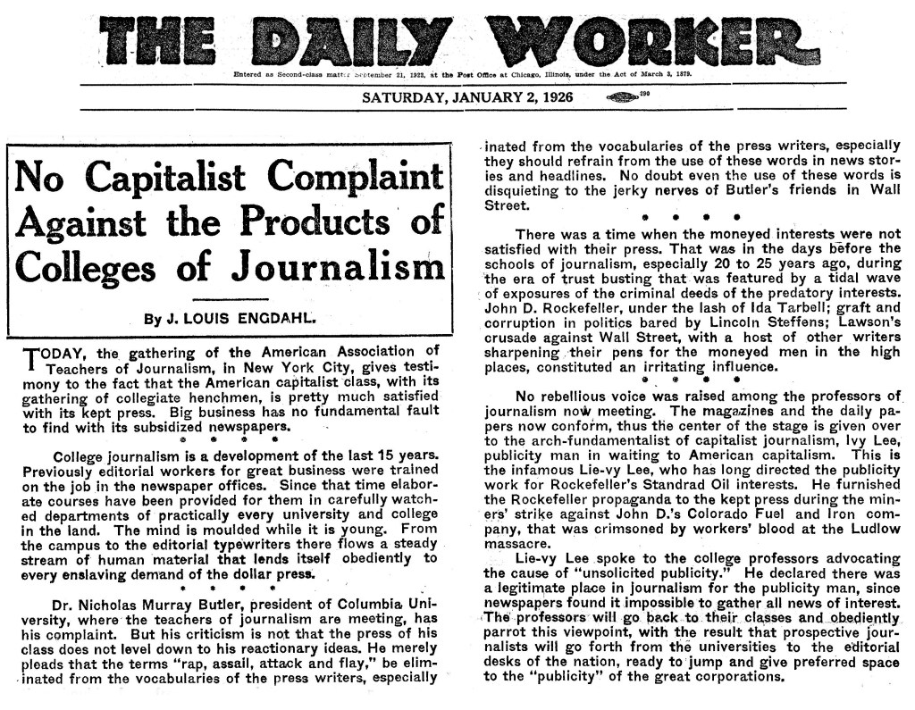“From the campus to the editor typewriters there flows a steady stream of human material that lends itself obediently to every enslaving demand of the dollar press,” John Louis Engdahl, an editor of the Communist Party organ, wrote in the Jan. 2, 1926 edition.